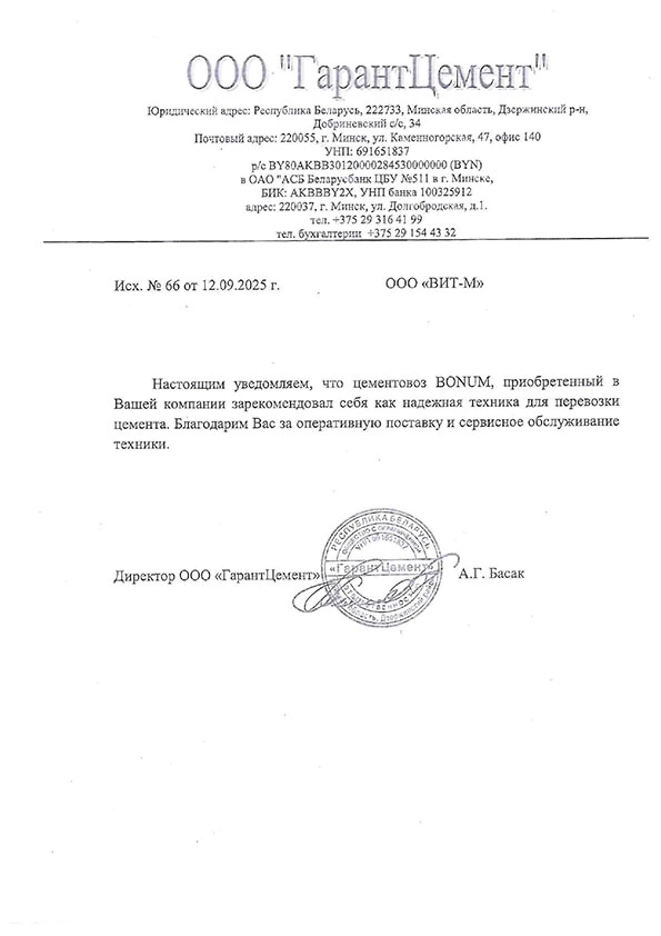 Настоящим уведомляем, что цементовоз BONUM, приобретенный в Вашей компании зарекомендовал себя как надежная техника для перевозки цемента. Благодарим Вас за оперативную поставку и сервисное обслуживание техники.