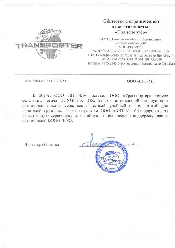 В 2024г. ООО «ВИТ-М» поставил ООО «Транспортер» четыре седельных тягача DONGFENG GX. За год интенсивной эксплуатации автомобили показали себя, как надежный, удобный и комфортный для водителей грузовик.