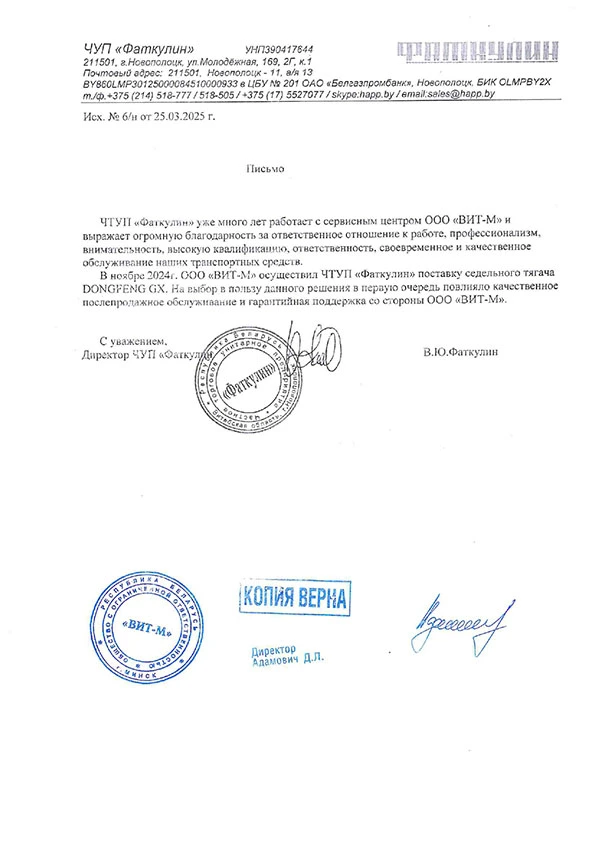 ЧТУП «Фаткулин» уже много лет работает с сервисным центром ООО «ВИТ-М» и выражает огромную благодарность за ответственное отношение к работе, профессионализм, внимательность, высокую квалификацию, ответственность, своевременное и качественное обслуживание наших транспортных средств.
